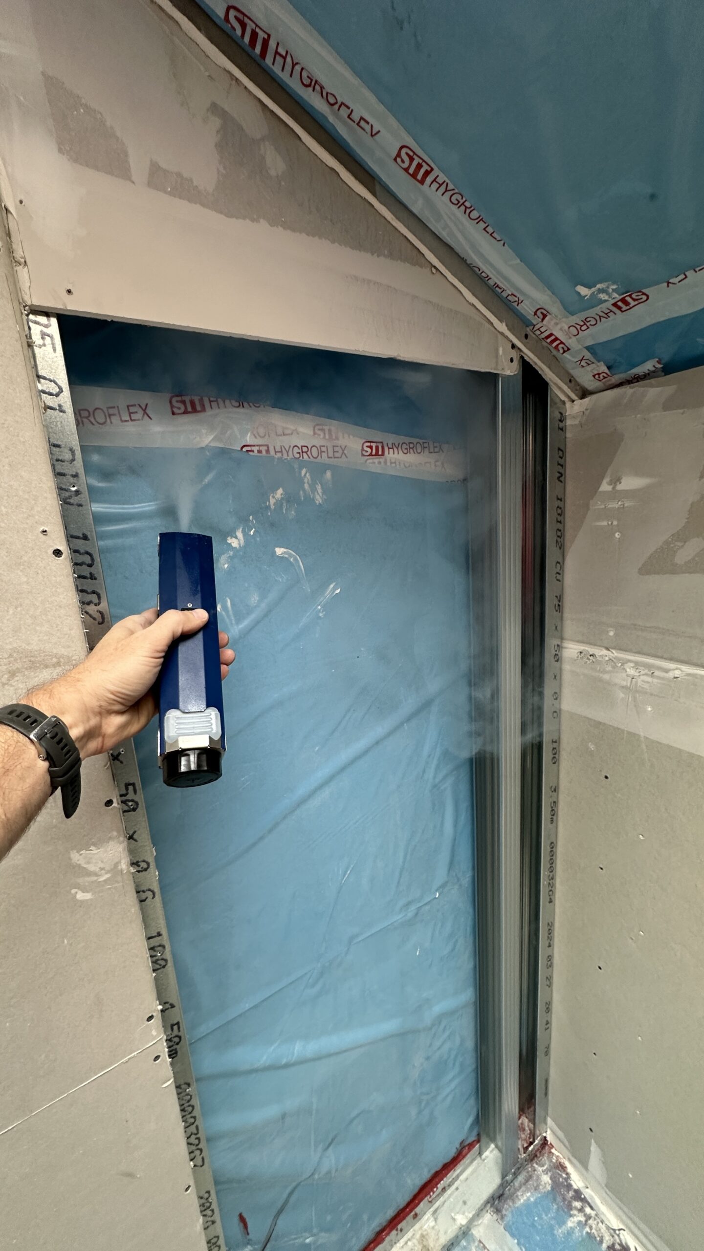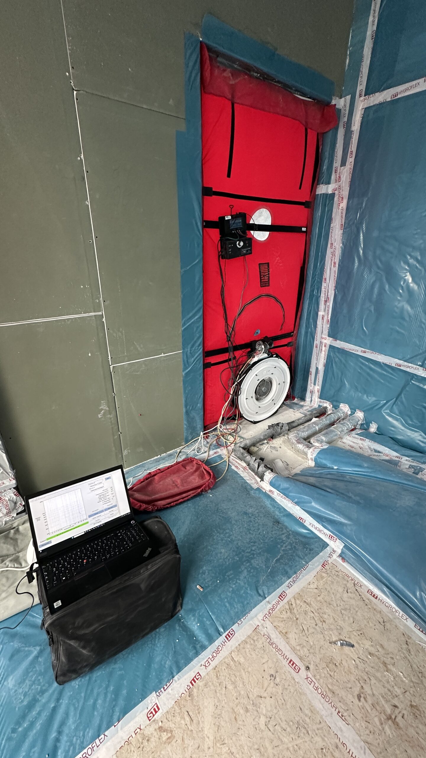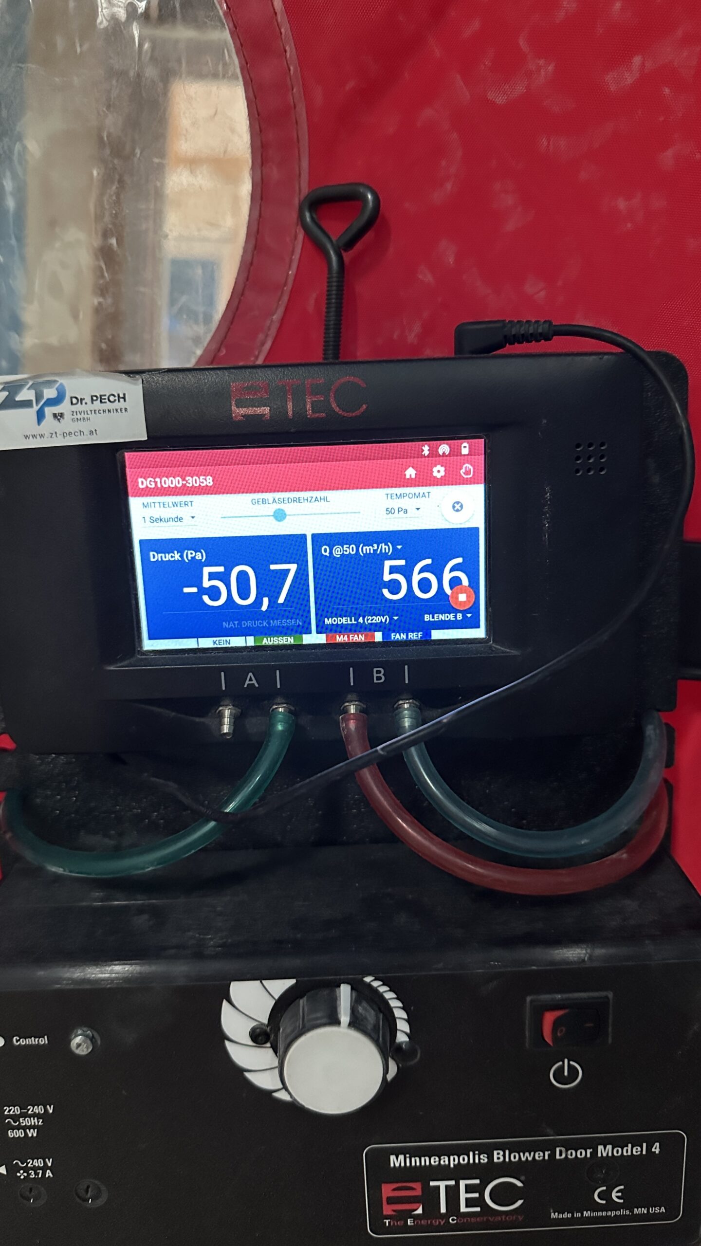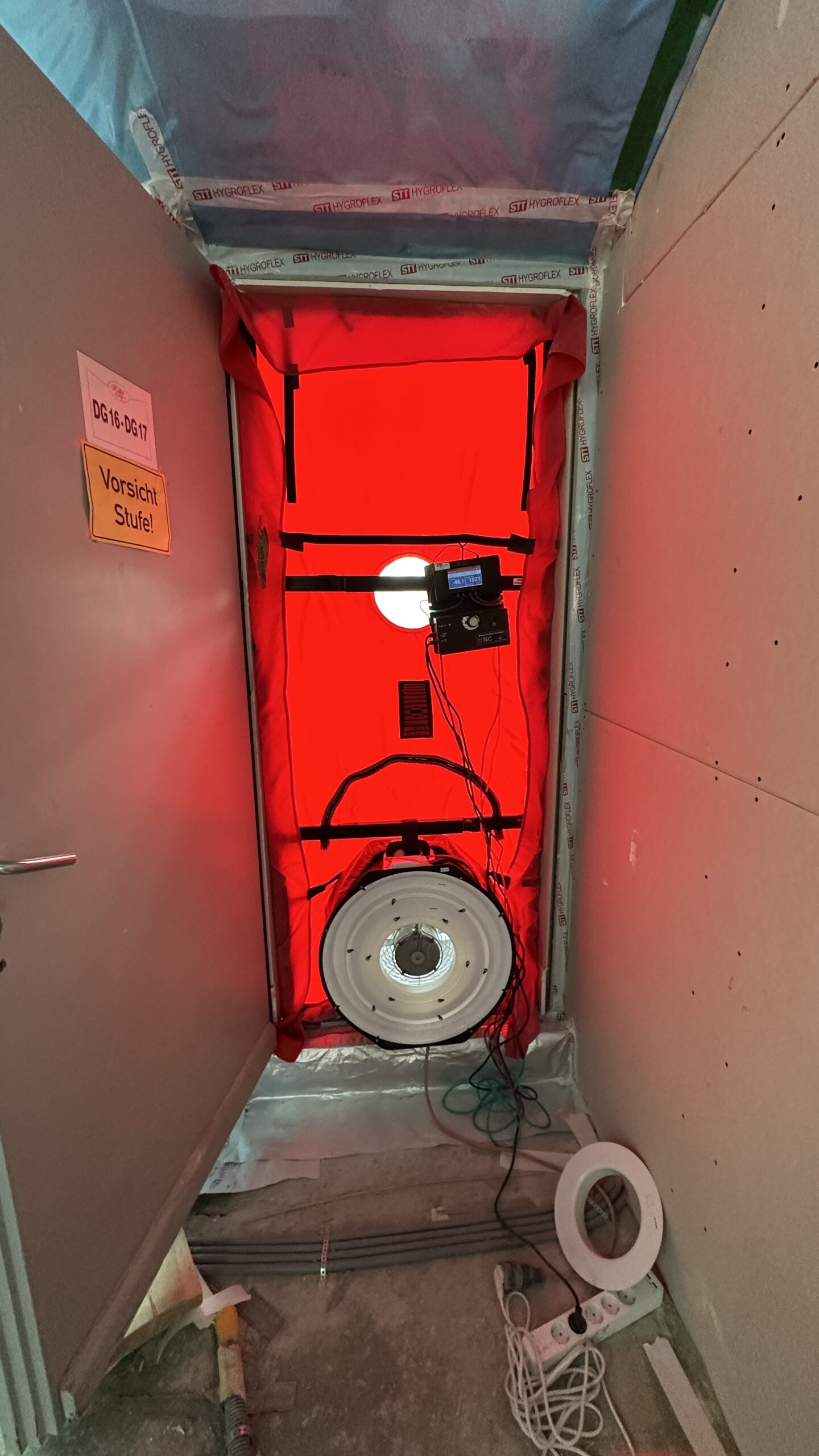 Im luftdichten Rohbauzustand wurden von März bis Mai 2025 Blower-Door-Tests in allen sieben Wohneinheiten durchgeführt. Da in zwei Wohnungen der normativ geforderte Grenzwert der Luftwechselzahl von n50 < 3,0 überschritten wurde, erfolgte mittels Nebel eine Leckageortung. Nach Ausbesserung der festgestellten Mängel und der erneuten Durchführung des Blower-Door-Tests erfüllten alle Wohneinheiten die geforderte Luftwechselzahl gemäß OIB-Richtlinie 6.