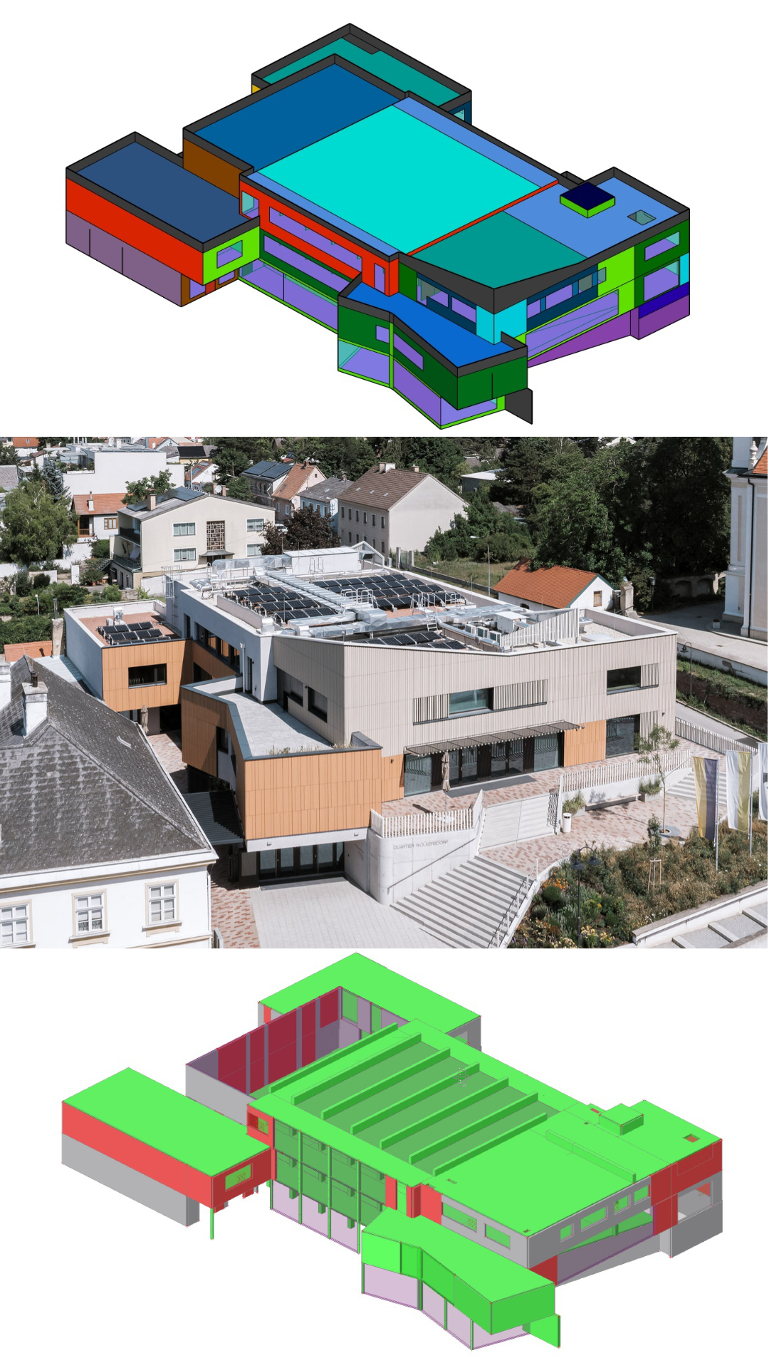 Ab Herbst 2023 wurde das Quartier Wolkersdorf (Baujahr 1972/73) umfassend modernisiert: Die Sanierung des bestehenden Gebäudes sowie die Erweiterung durch einen neuen Zubau bildeten den Kern des Projekts. Für diese Maßnahmen war ein gezielter Teilabriss notwendig, um die baulichen Voraussetzungen für die hochwertige Weiterentwicklung des Bestands zu schaffen. Das Erdgeschoß wird durch die Pfarre genutzt, in den beiden Obergeschoßen befinden sich die Räumlichkeiten der Stadtgemeinde. Im Obergeschoß bietet ein Veranstaltungssaal Platz für ca. 300 Besucher. Der Rohbau wurde Ende Juli 2024 fertiggestellt und im Jänner 2025 konnte die erste Veranstaltung dort stattfinden. Die Umbauphase konnte in insgesamt 16 Monaten planmäßig abgeschlossen werden.