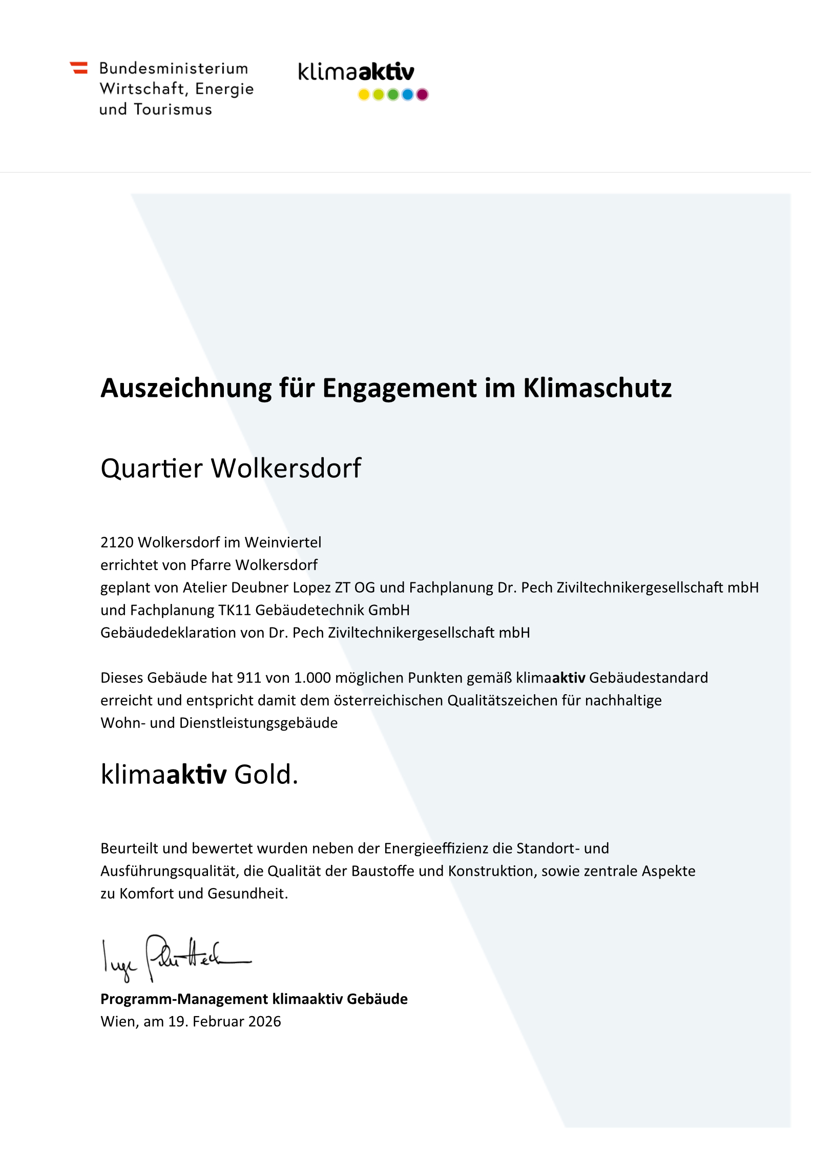 Das Gebäude wurde nach dem klimaaktiv Kriterienkatalog deklariert und geprüft, dabei konnten 911 von 1000 Punkten erzielt werden und damit die Qualitätsstufe klimaaktiv Gold. Die Gebäudedeklaration sowie die Fachplanung im Bereich Bauphysik erfolgte über die Dr. Pech Ziviltechnikergesellschaft mbH.